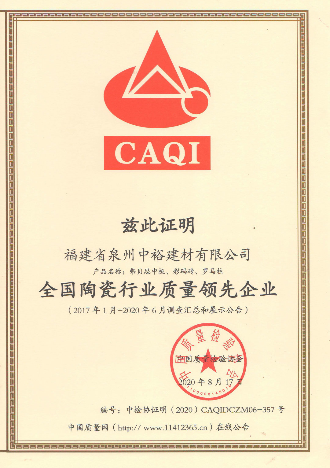 全国陶瓷企业质量领先企业